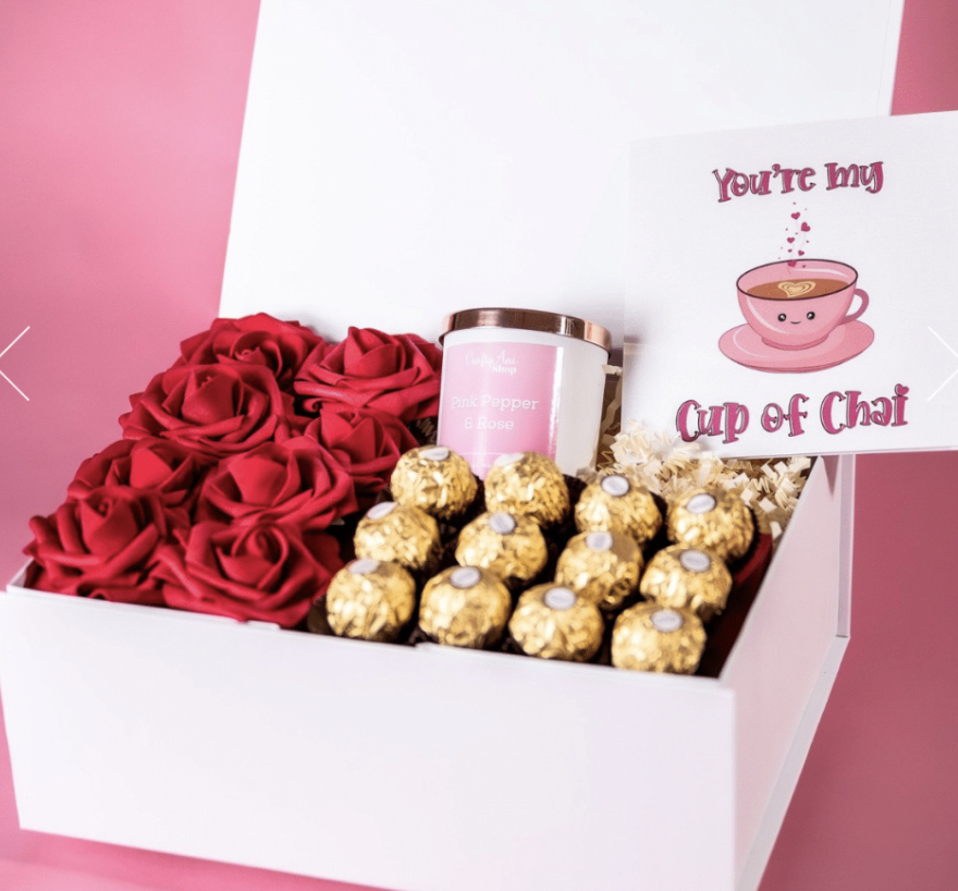 Surprise your loved one with a gift hamper featuring a heartfelt Valentine’s card, a Coconut & Rapeseed Candle, Ferrero Rocher Chocolates along with eight faux red roses.