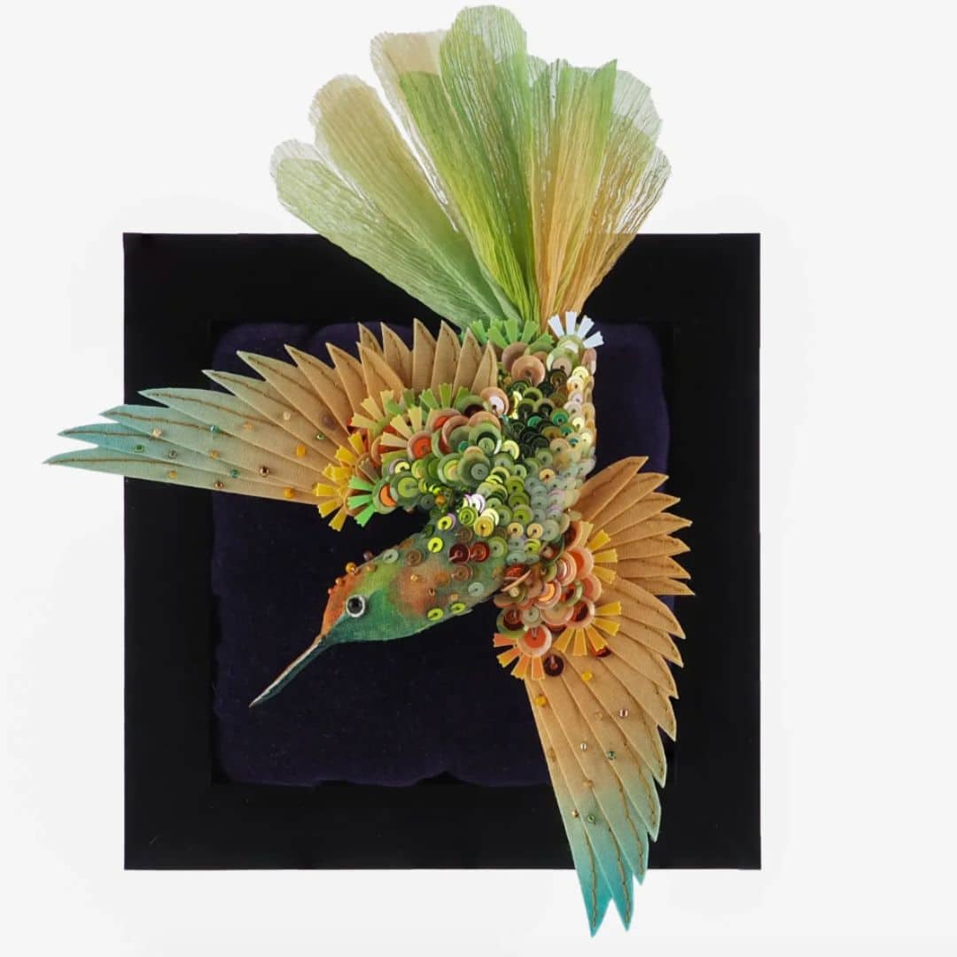 These handcrafted brooches capture the beauty of critically endangered hummingbirds, made with hand-dyed silk, velvet, and vintage beads.